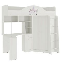 Состоит из: шкафа для одежды, стола, выдвижного ящика, шкафа с полкой, спального места, полок.