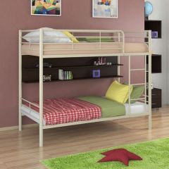 Материал каркаса: стальная труба. Все металлические элементы кровати покрыты износоустойчивой полимерной порошковой краской без запаха. Полка изготовлена из ЛДСП, цвета: Венге, Дуб молочный.