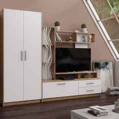 Гостиная Дарья – это компактная стенка, которая ничем не уступает по вместительности большим гарнитурам. На стеклянном фасаде стеллажа нанесен интересный волнообразный орнамент. ТВ-тумба включает в себя одну большую секцию, в которой легко поместятся все необходимые для тв зоны атрибуты. Вместительный шкаф с перегородкой. Одна секция шкафа представляет собой отдел с полками, а во второй расположена выдвижная штанга под одежду.